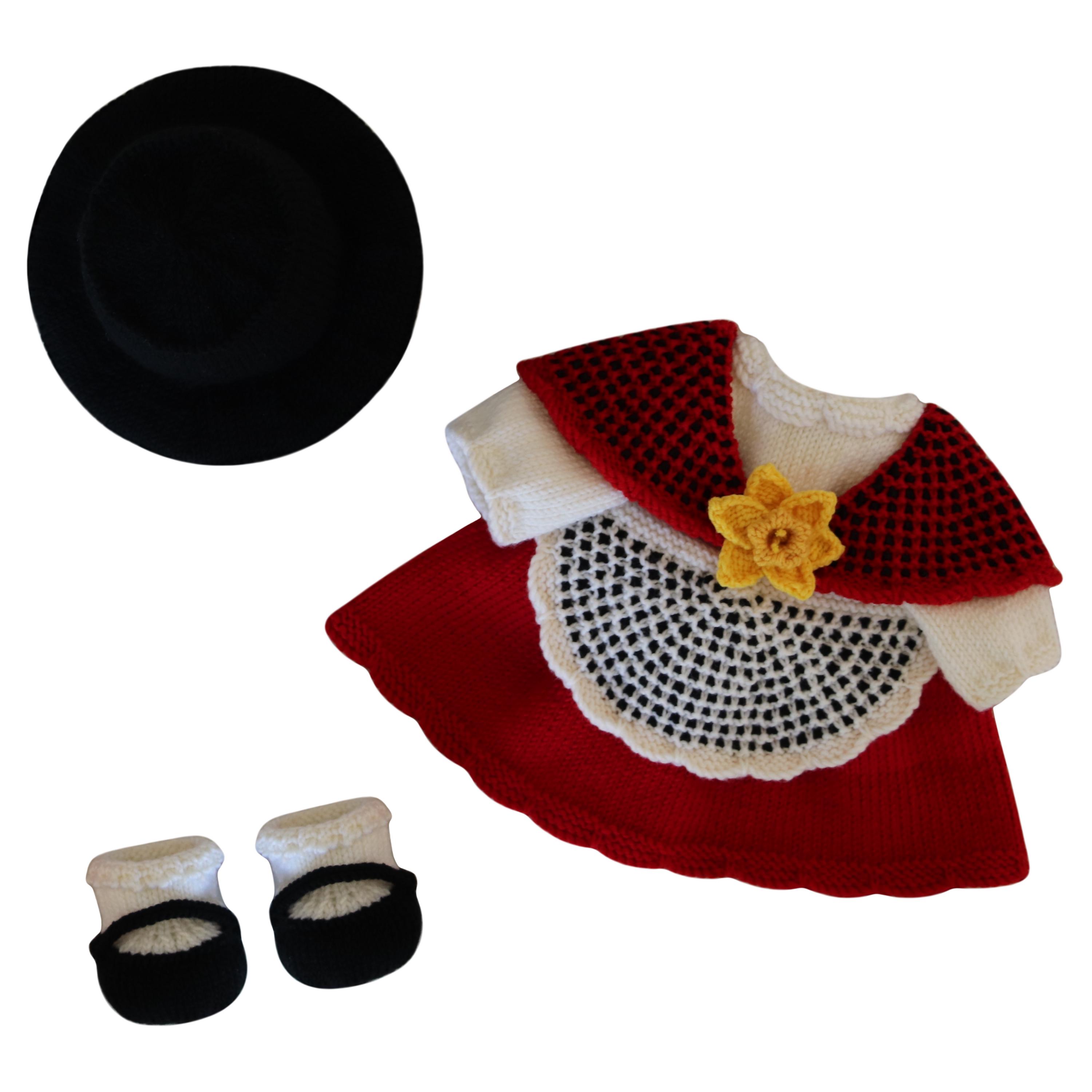 The pattern includes a dress, apron, shawl with daffodil, shoes and hat. It is designed to fit the teddies and dolls in the Knit a Teddy range. The clothes will also fit 15" shop bought teddy bears.