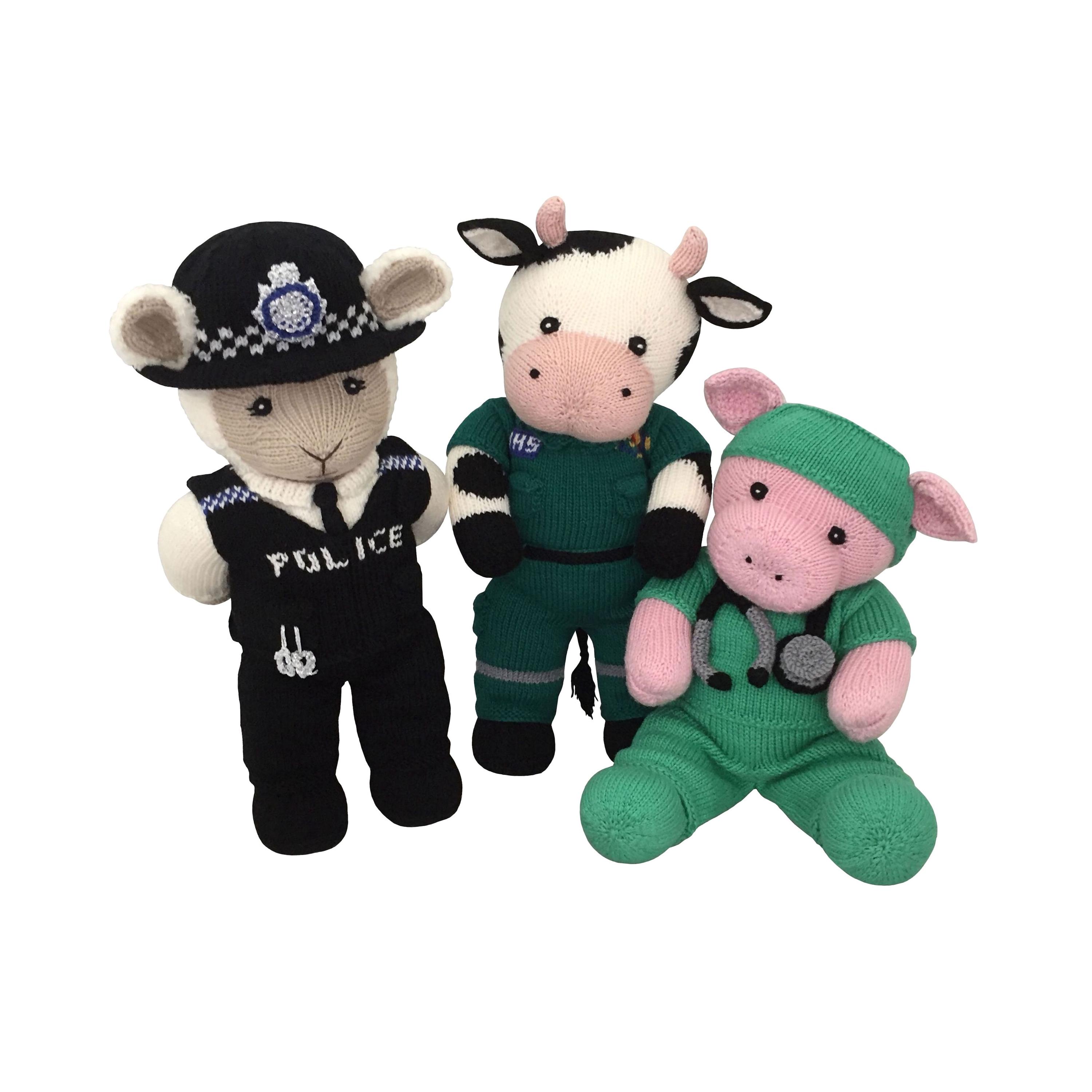 This collection includes the Pig, Sheep and Cow teddies (3 PDFs) and the Police Officer, Paramedic and Scrubs Outfit patterns (1 combined PDF). The outfits are designed to fit the teddies and dolls in the Knit a Teddy range. The clothes will also fit 15" shop bought teddy bears.