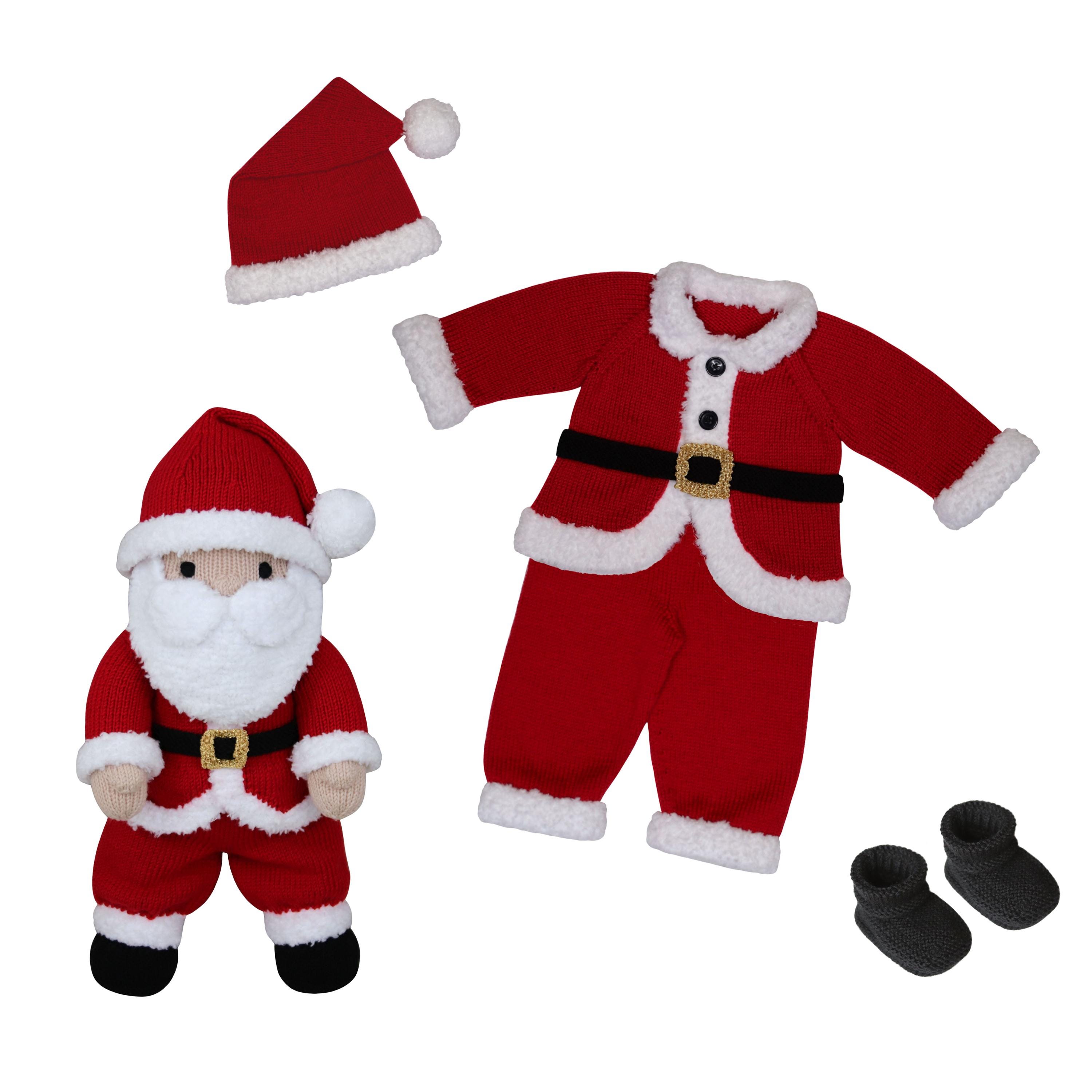 The pattern has clear row by row instructions and lots of photographs and video tutorials to help you along the way. You will need to be able to knit, purl, cast on and off, increase and decrease, change colours and sew seams. All pieces are knitted flat on straight needles. This pattern includes the Santa suit in five sizes, hat, boots and Santa’s beard! The Santa suit will also fit 15" shop bought teddy bears.