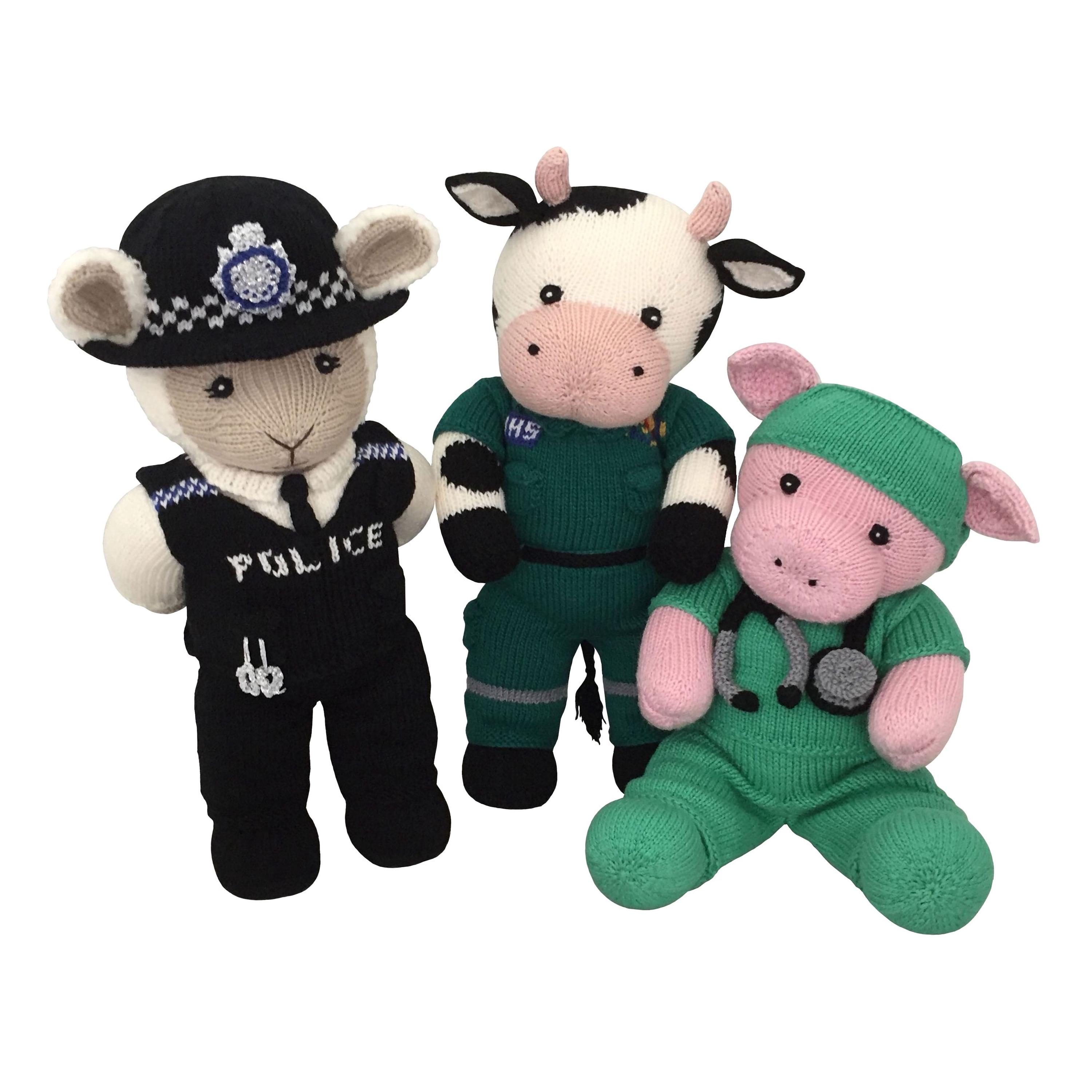 The majority of the Knit a Teddy animals and dolls measure approximately 38cm (15in) when standing, although some of the animals, such as the giraffe and lion, are slightly taller. Please refer to the individual listings for the exact sizes. The clothes are designed to fit all the animals and dolls, although some of the hats may not fit some of the animals. The clothes also fit shop bought 15in teddy bears.
