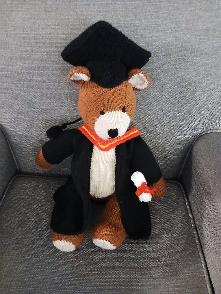 This pattern includes the graduation gown, faculty colours, mortarboard and scroll. As with all the patterns in my ‘Knit a Teddy’ collection, this outfit is completely interchangeable and will fit all the animal teddies in the range. Alternatively this outfit would also fit a 15” teddy bear!