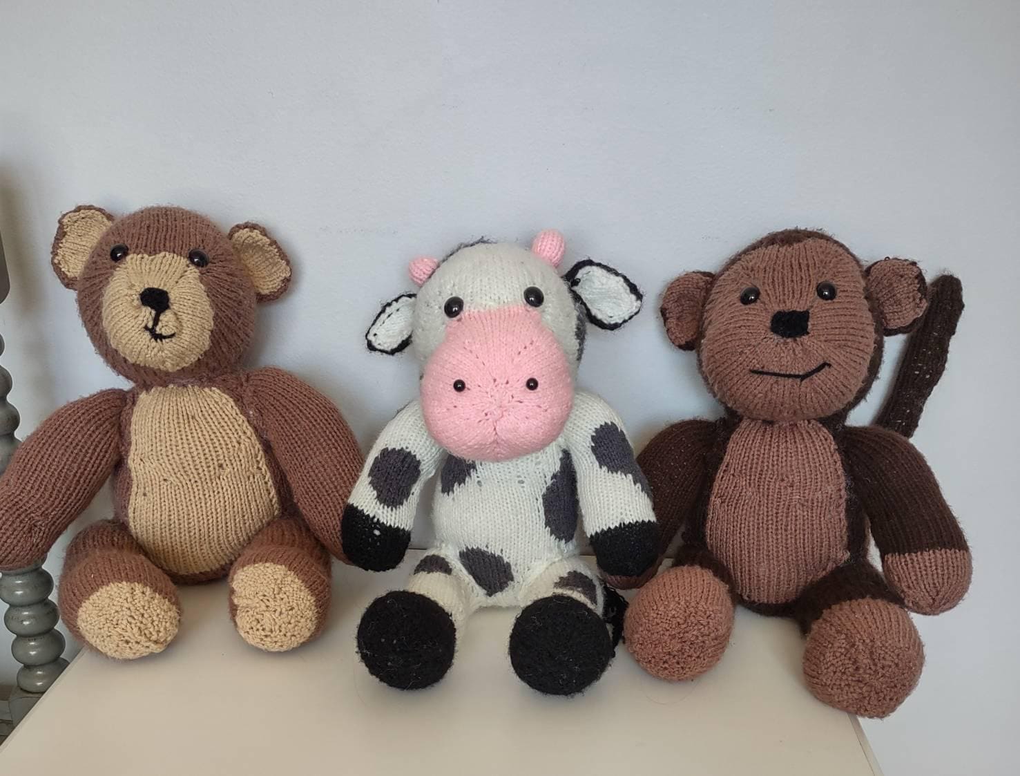 The majority of the Knit a Teddy animals and dolls measure approximately 38cm (15in) when standing, although some of the animals, such as the giraffe and lion, are slightly taller. Please refer to the individual listings for the exact sizes. The clothes are designed to fit all the animals and dolls, although some of the hats may not fit some of the animals. The clothes also fit shop bought 15in teddy bears.