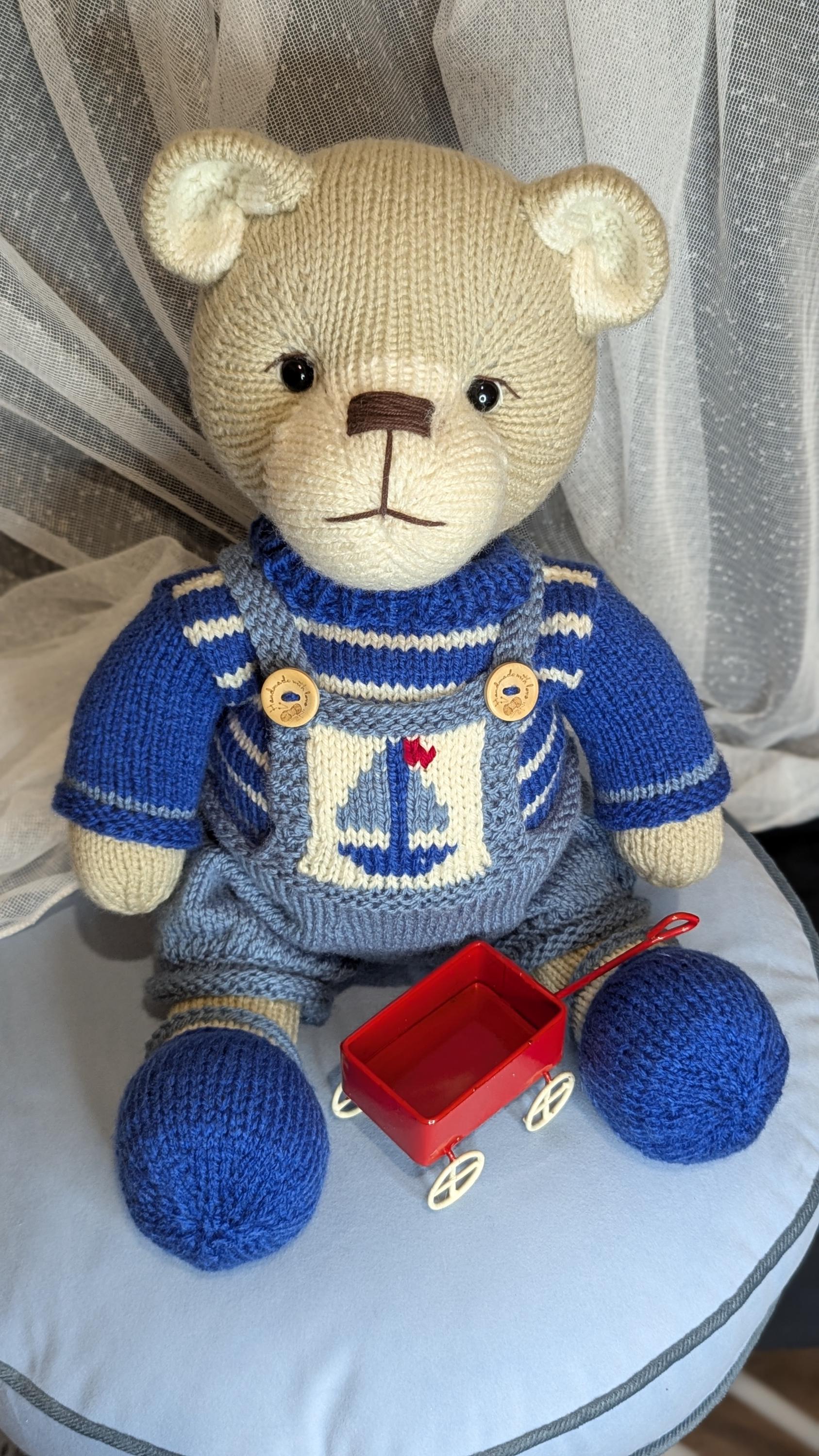This pattern includes a stripy jumper, dungarees with a sailing boat emblem and a pair of socks and shoes. The inspiration for this design was an outfit worn by HRH Prince George of Cambridge. It is designed to fit the teddies and dolls in the Knit a Teddy range. The clothes will also fit 15" shop bought teddy bears.