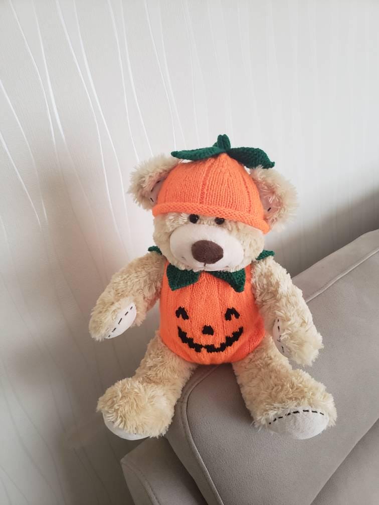 This pattern includes a pumpkin costume, a hat and shoes. As with all the patterns in my ‘Knit a Teddy’ collection, this outfit is completely interchangeable and will fit all the animal teddies in the range. Alternatively this outfit would also fit a 15” teddy bear!