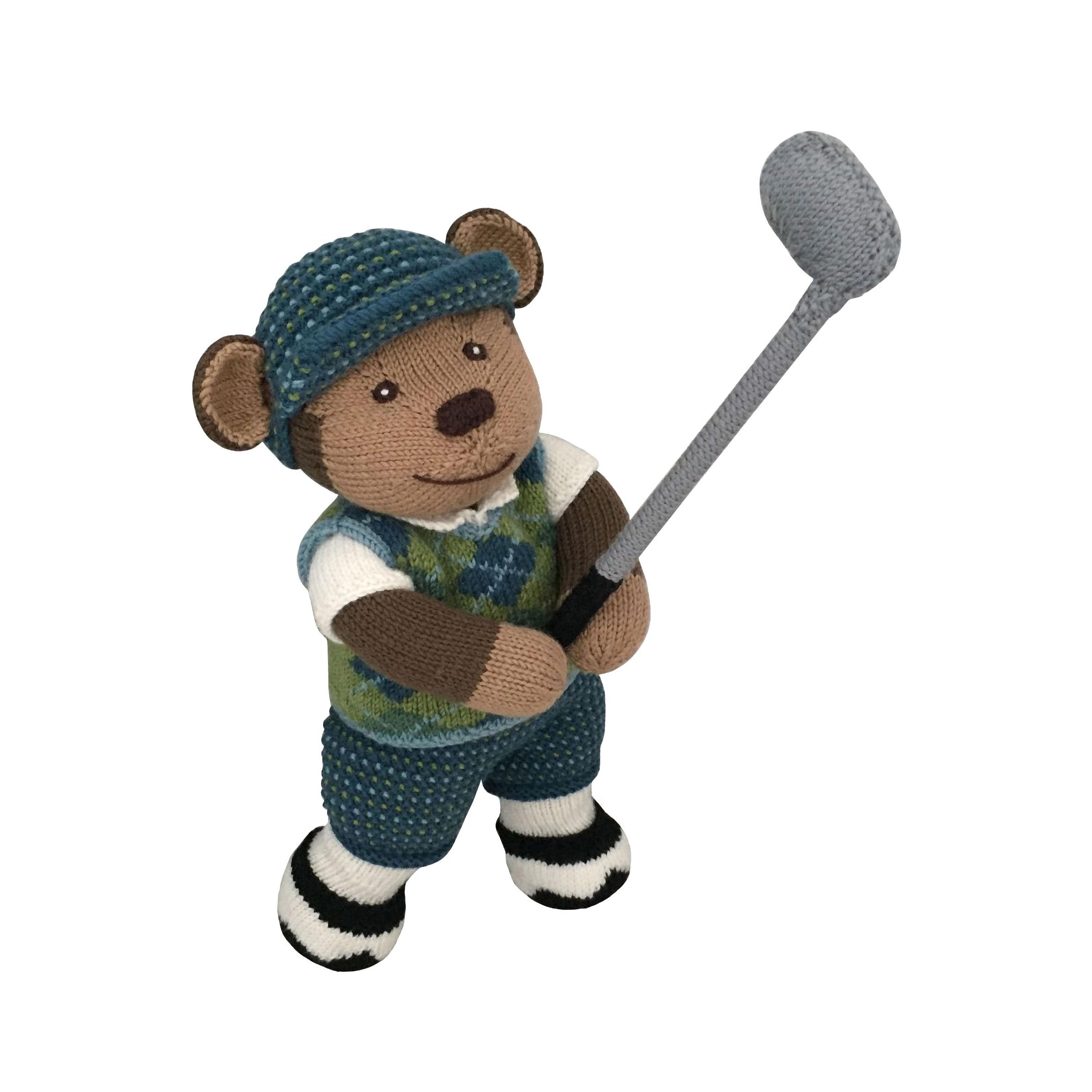 The pattern includes a polo shirt, an argyle vest top, trousers, a cap, shoes, socks and a golf club. It is designed to fit the teddies and dolls in the Knit a Teddy range. The clothes will also fit 15" shop bought teddy bears.