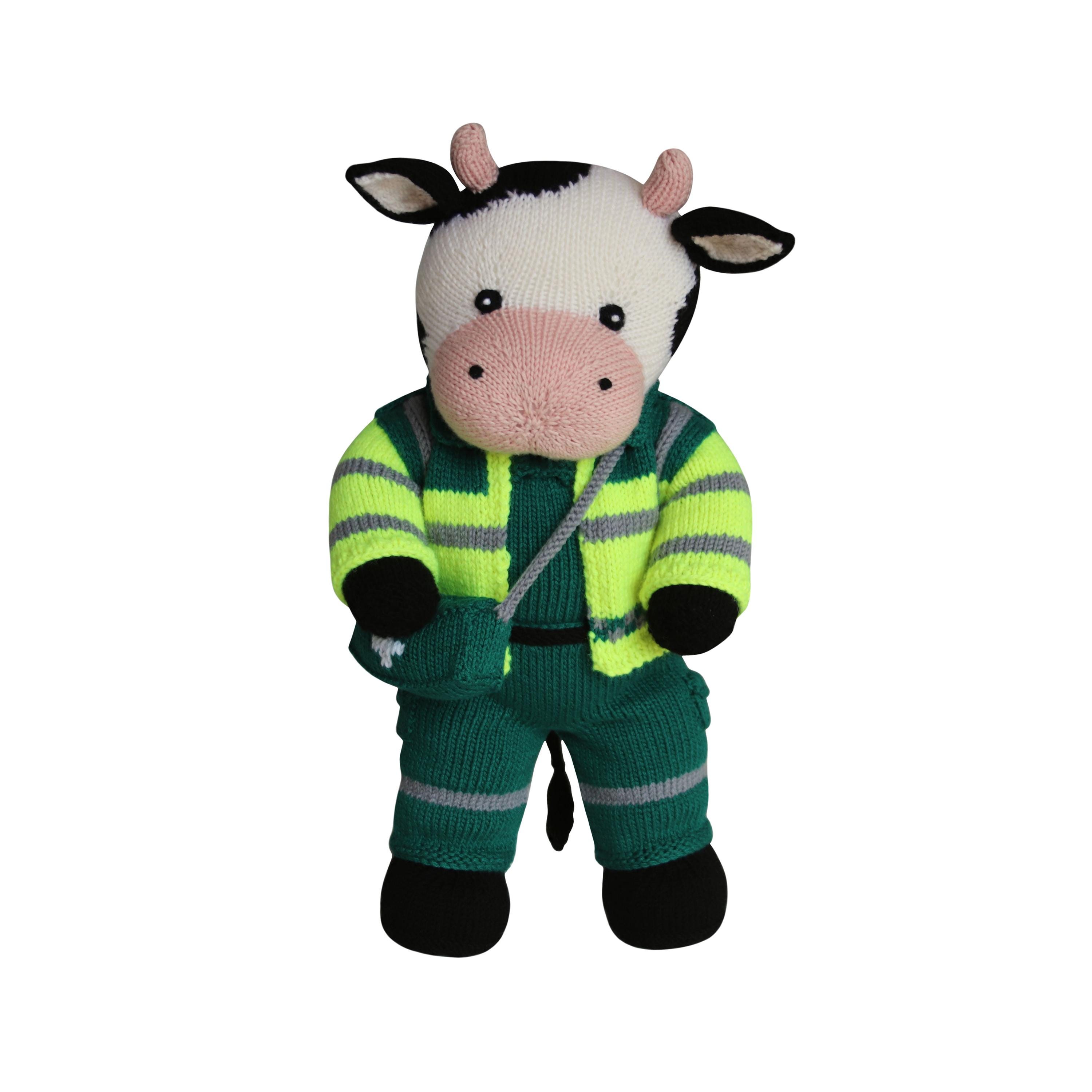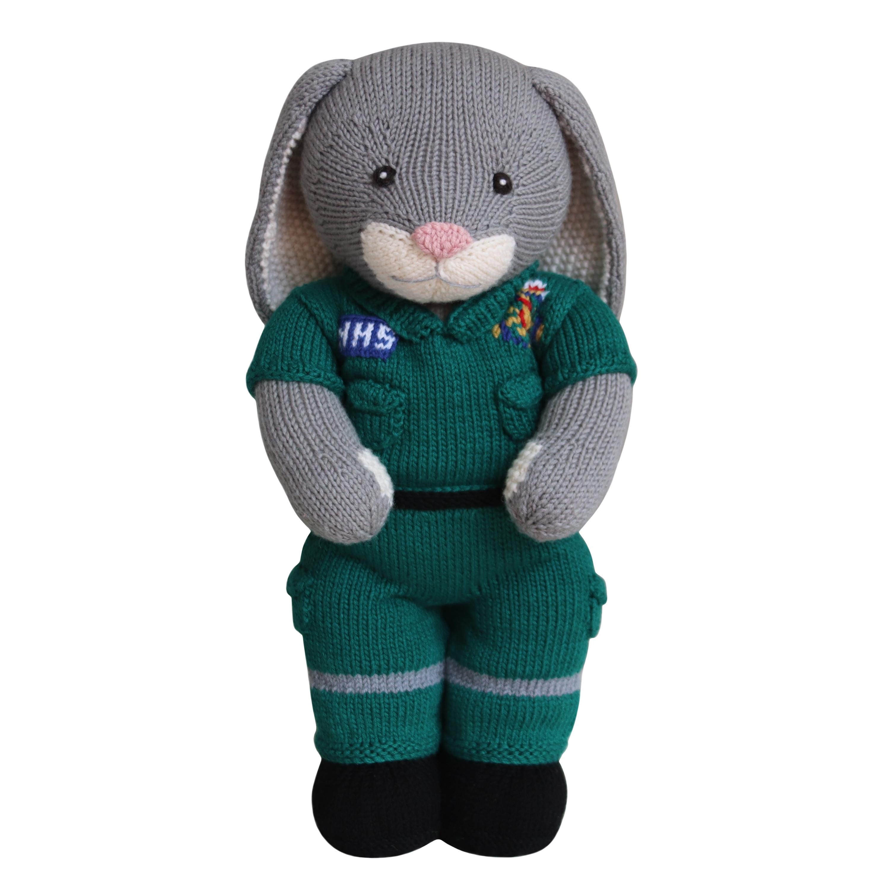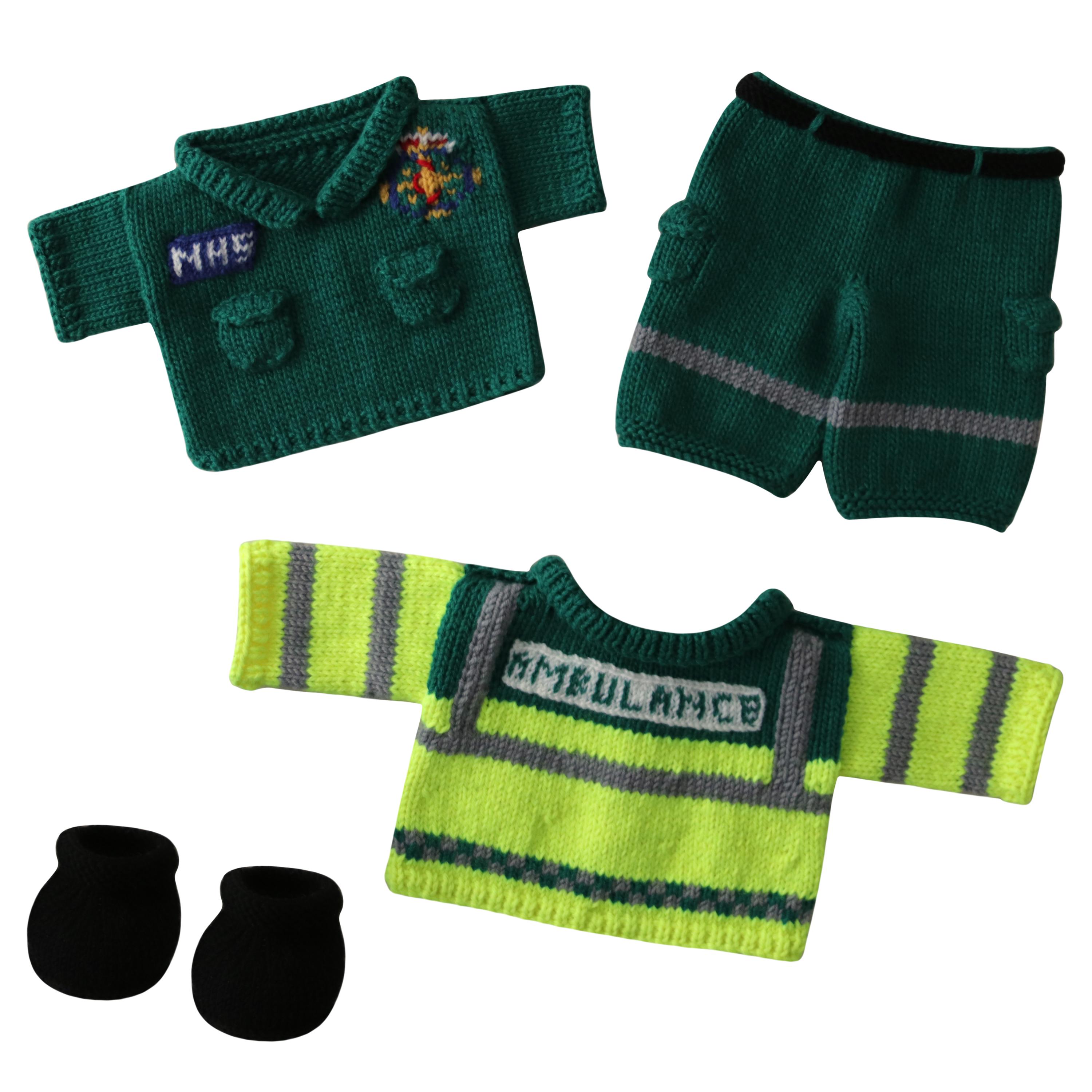 The pattern includes a shirt, jacket, trousers, boots and a paramedic bag. It is designed to fit the teddies and dolls in the Knit a Teddy range. The clothes will also fit 15" shop bought teddy bears.