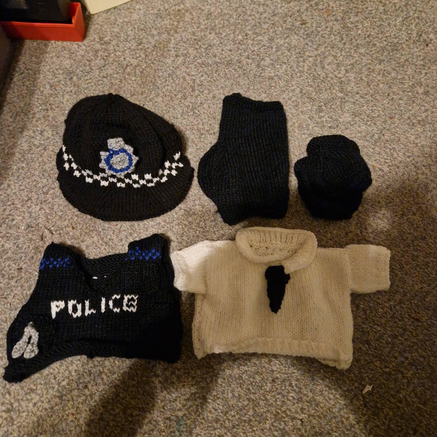 Please note: This listing is for the digital KNITTING PATTERN to create the pictured police officer outfit. It is not for the finished item, and it does not include any of the teddies.