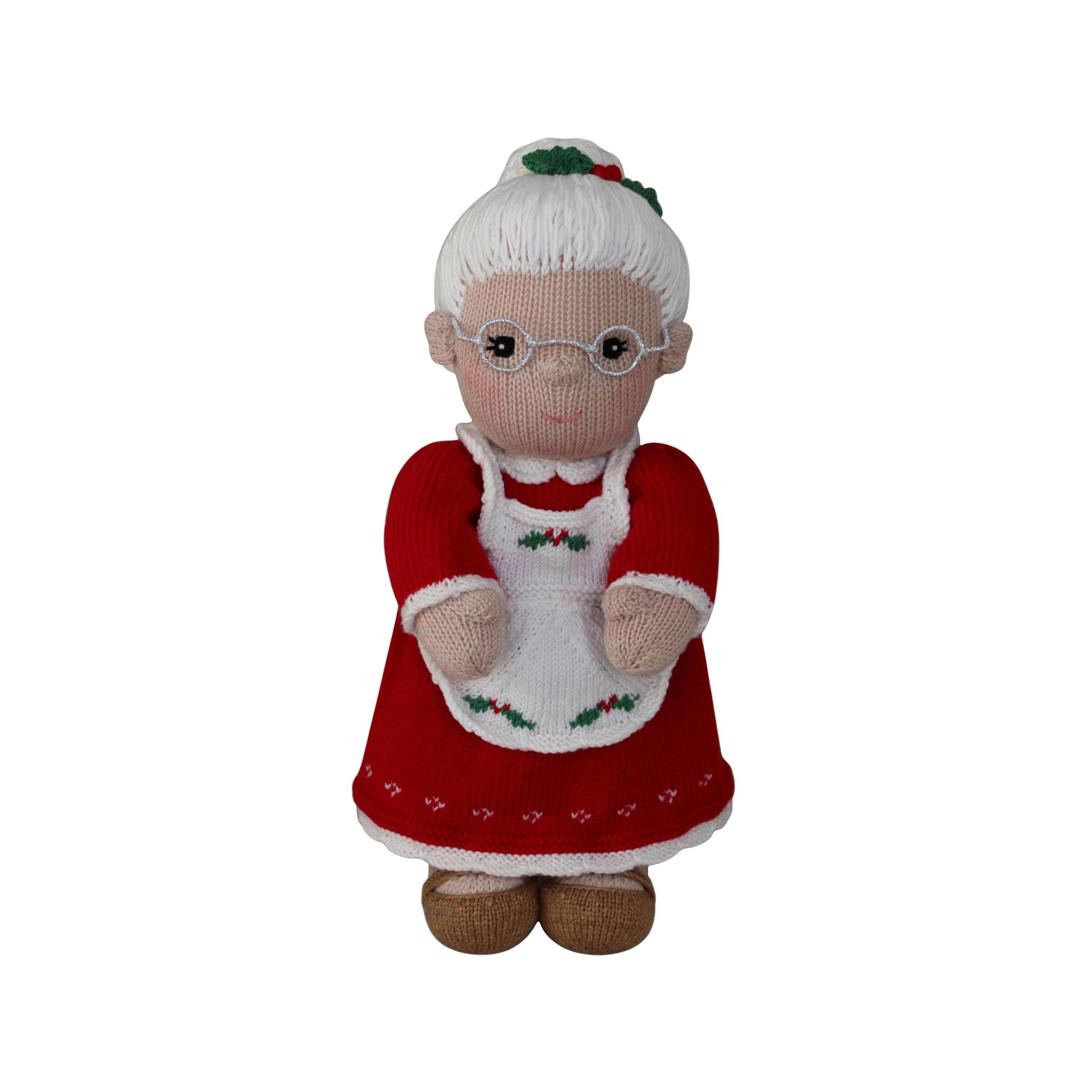 The pattern includes Mrs Claus's dress, apron, shoes and hair accessories. It is designed to fit the teddies and dolls in the Knit a Teddy range. The clothes will also fit 15" shop bought teddy bears.